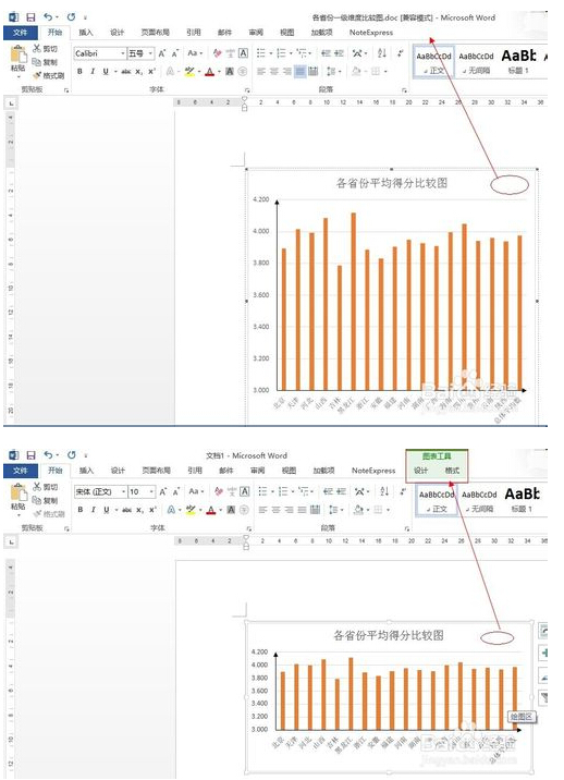 4、现在还有一个问题,假如word是2007版以前的怎么办,也就是我们打开的word是兼容模式的,那么这个时候可以对照一下,都将Excel表中的图复制为没有链接的目标文件。会发现在兼容模式下就没有了在图上可以进行直接修改的标记了。如下图。
