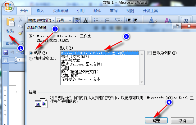2、之后打开WORD文件,点击工具栏的“粘贴”--选择性粘贴--EXCEL工作表对象。