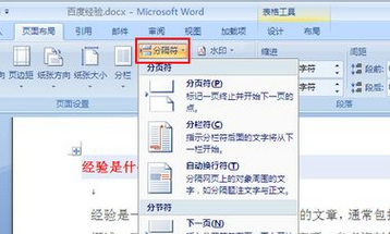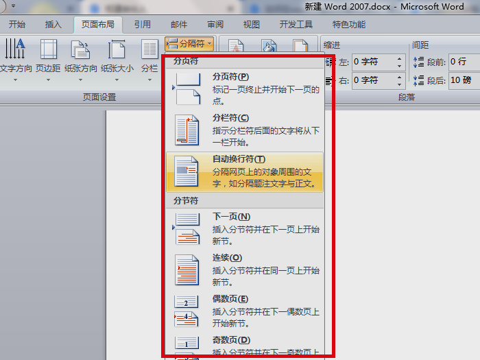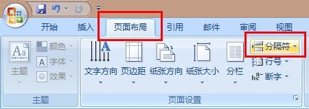 Word07的分隔符在页面设置选项卡,如图所示。