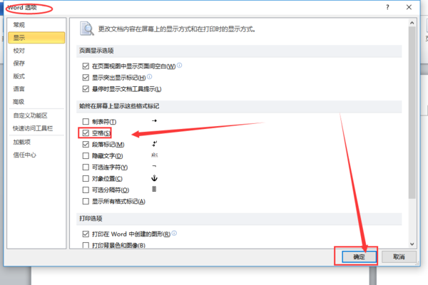 2、在WORD选项中找到“始终在屏幕上显示这些格式标记”,勾选“空格”,然后点击确定按钮。