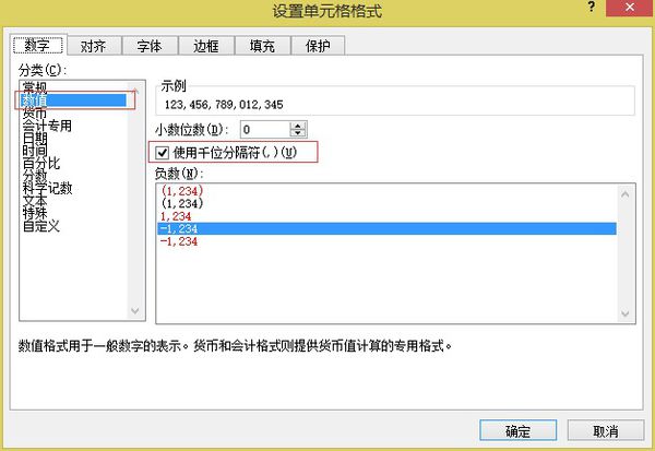 第二步:“分类”设为“数值”,勾选“使用千位分隔符”,单击确定按钮。