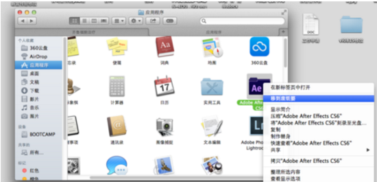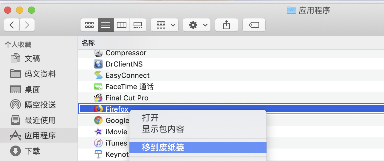 进入之后我们就能看见我们电脑上自己安装的所有程序,我们选择自己想要卸载的软件,点击鼠标右键,选择移动到废纸篓。
