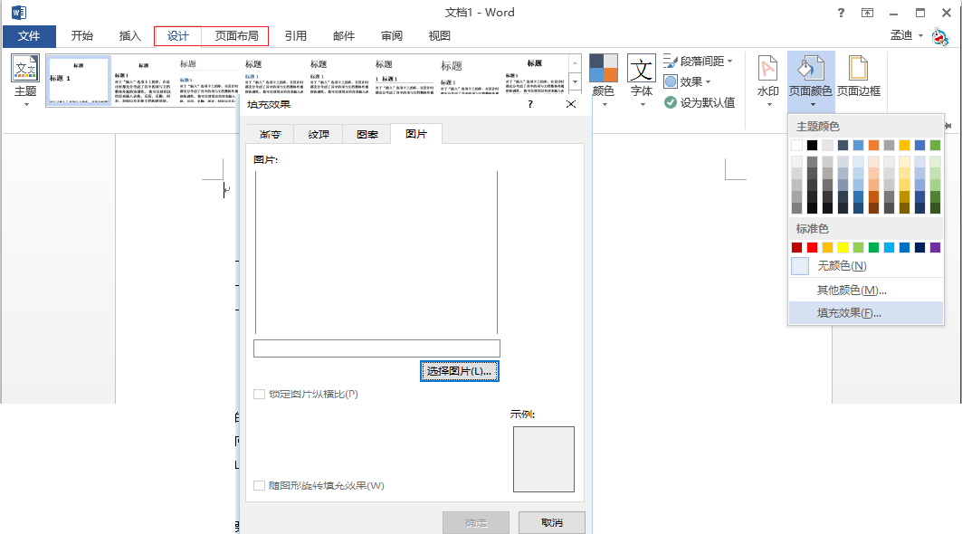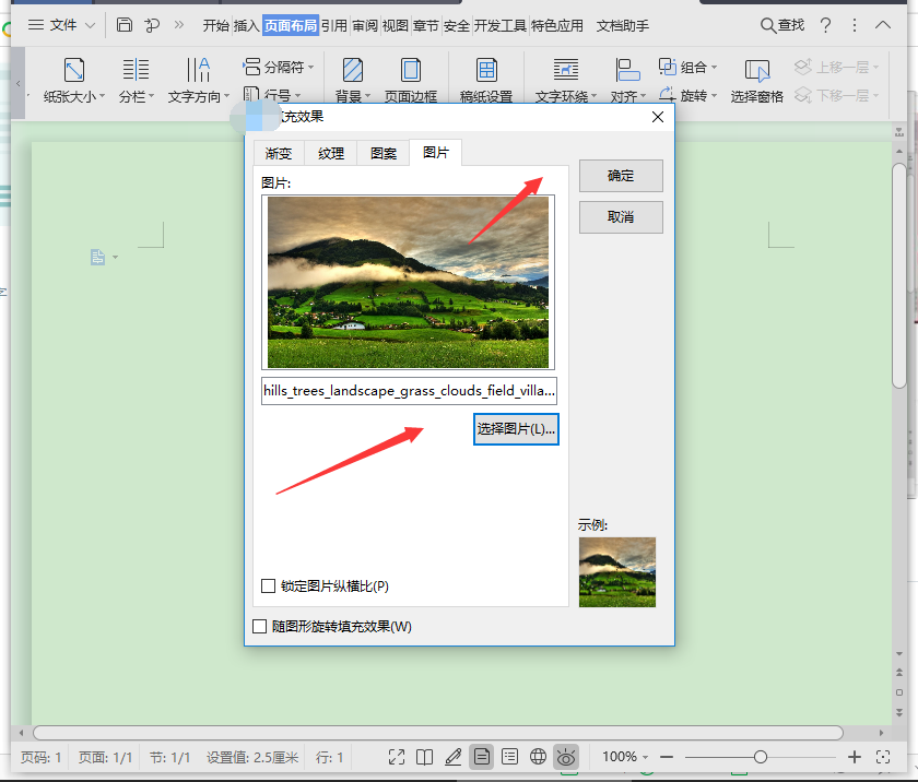 3、在弹出的窗口中点击“图片”按钮,然后点击“选择图片...”按钮从电脑上选择图片,这时被选择的图片就会变成文档背景: