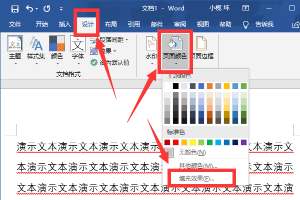1、打开word文档,在顶部菜单栏依次选择“设计”-“页面颜色”-“填充效果”: