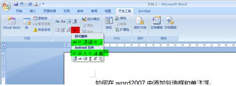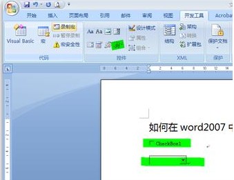 进入开发工具菜单,点击一下“设计模式”将文档变为设计模式状态,文档在设计模式下才能插入、修改复选框等控件。