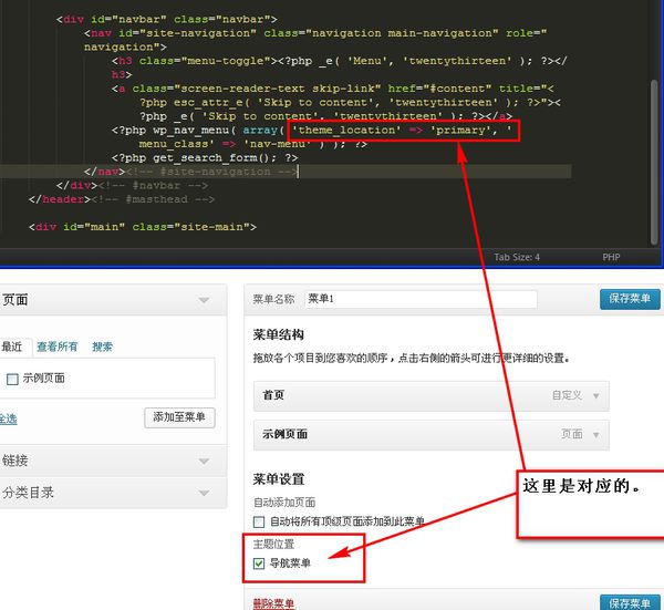 在当前皮肤下,header.php文件里找到wp_nav_menu函数,其中theme_location的值为后台编辑菜单的依据,(表示“主题位置”)。