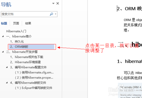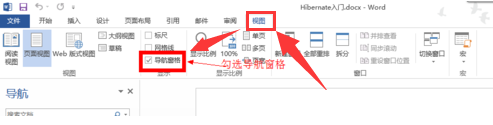 6、在导航视图前面打上√后,就能在word左侧形成目录栏。当点击左侧目录栏中的目录类容,就能自动调转到word中的该内容。