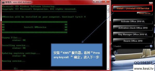 其次,点击“Install/UninstallKMService”安装“KMS”服务器;