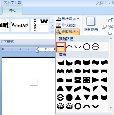 3、单击艺术字工具格式----更改形状,在弹出的下拉选项中选择如图所示的形状;