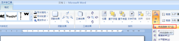 6、选中上面的艺术字,单击艺术字工具格式----旋转----向右旋转90度,再重复一次,使之旋转180度;
