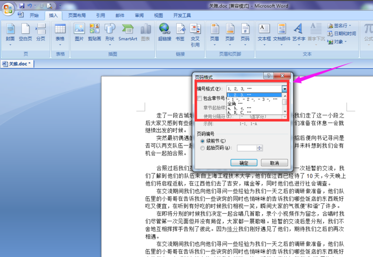 5、在打开的页码格式属性栏中,编号格式中下拉菜单中有多种格式选择,选择其中的一种