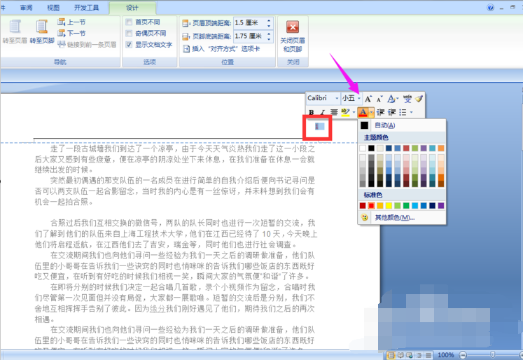 7、在页眉中输入文字信息,如果想要更改文字信息时,将文字选中,鼠标经过文字时就会出现文字编辑栏,在编辑栏中选择字体颜色、字号的设置。