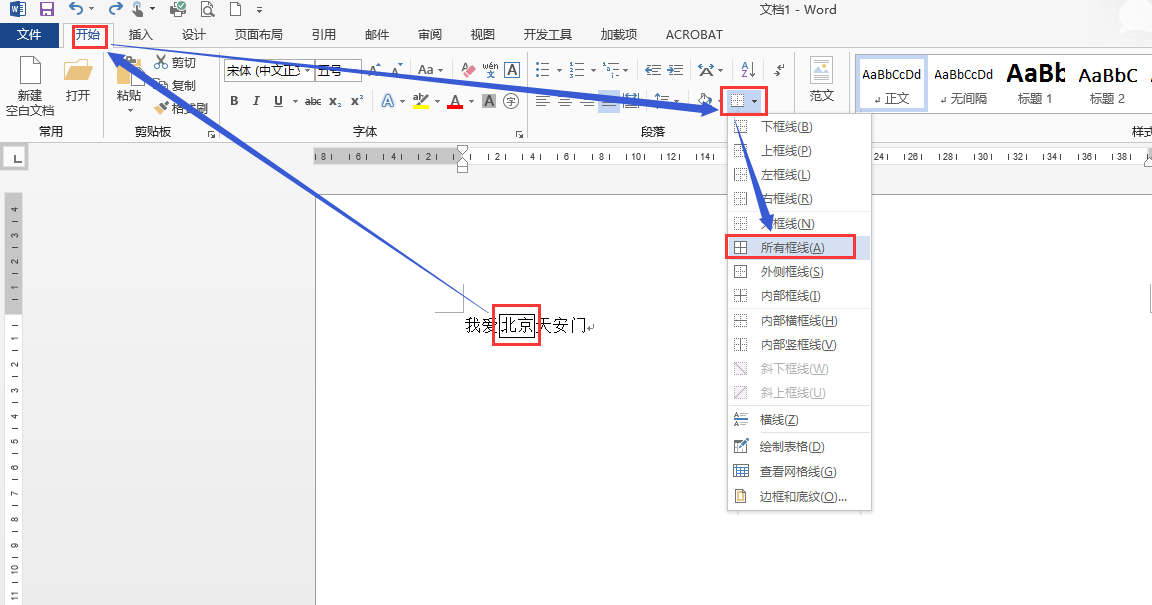 3、单击边框按钮右侧的箭头,选择所有框线或者外侧框线均可。