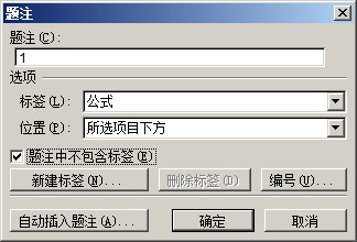 光标放在公式之后,不要(注意是“不要”)选中公式,在“插入|引用”菜单选“题注”(2007中是引用-插入题注),由于没有选中项目,所以“位置”一项为灰色,新建标签“公式1-”,在编号一项选中包含章节号,点击“确定”。