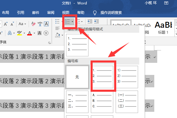 2、选择顶部工具栏中编号工具,在展开的列表中选择如图所示常用的编号格式,点击这个格式按钮: