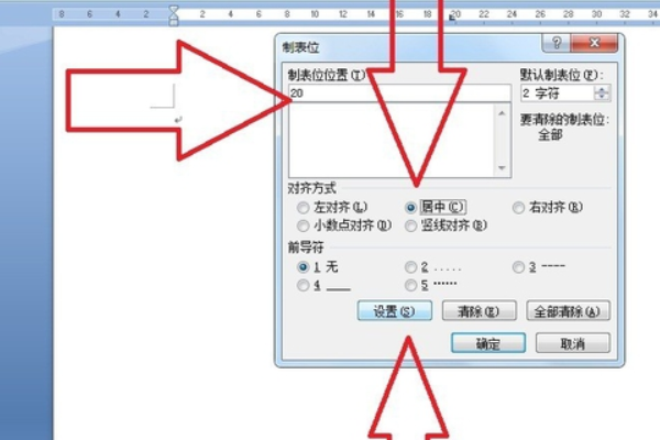 1)因为公式要居中,在标尺中观察中间的位置,我这里是20字符左右.在"制表符位置"处添入20,"对齐方式"选"居中",选"设置".