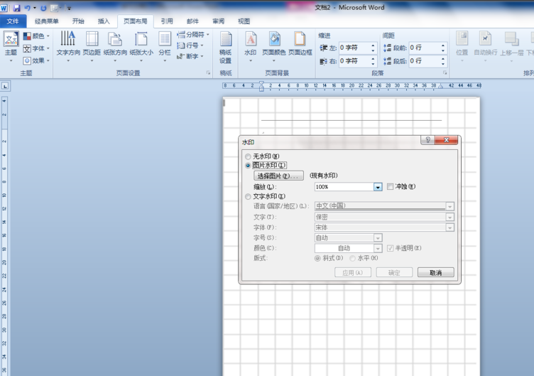 6、打开Word2010,在“绘图网格”中去掉显示网格的勾选。单击“页面布局”选项卡,在“页面背景”组选择“水印”按钮,接着将保存的网格图片按“自定义水印”、“图片水印”插入文档页面,注意设置“缩放:100%”、去掉“冲蚀”的勾选。