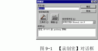 (1)单击【工具】菜单中的【宏】命令,从级联菜单中选择【录制新宏】命令,出现【录制宏】对话框,如图9-1 所示。