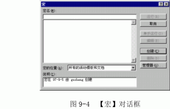 (1)单击【工具】菜单中的【宏】命令,从级联菜单中选择【宏】命令,出现【宏】对话框,如图9-4 所示。