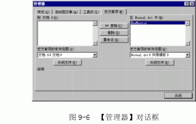 (5)从任一列表框中选定要复制的宏,然后单击【复制】按钮。就可将该宏复制到另一侧的【宏方案项的有效范围】列表框的文档或模板中。