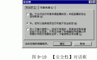 (1)单击【工具】菜单中的【宏】命令,从级联菜单中选择【安全性】命令,出现【安全性】对话框,如图9-10 所示。