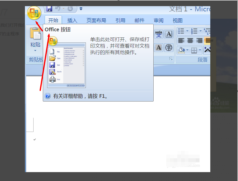 3、我们把鼠标放在左上角上边,我们就会看到office按钮的选项卡