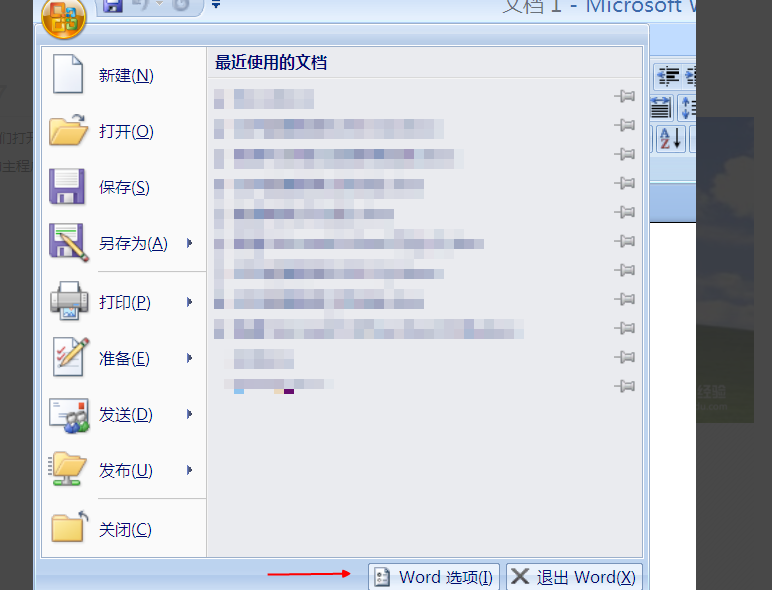 4、点击office按钮之后,我们点击下边的word选项