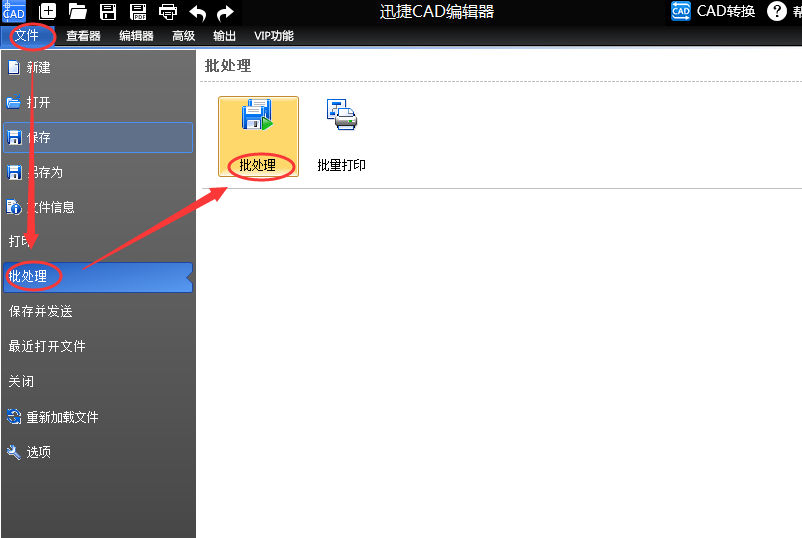 4在批量转换文件和图纸方面,我们可以点击左上角的文件,接着点击下面的批处理,再次点击右侧的批处理,就可以成功进入批处理的页面。