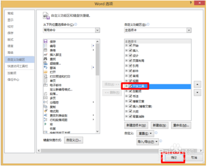 (1)然后,从打开的“Word选项”界面中,切换至“自定义功能区”选项进入,在打开的“自定义功能区”选项卡中,勾选“主选项卡”界面中的“开发工具”选项。点击“确定”完成设置,如图所示
