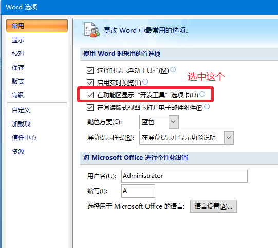 出现两列,第二列中靠中间的位置有个开发工具,默认没有打勾,将这个选项勾上然后点击确定