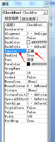5、把caption的值改为要显示在复选框后的内容,例如:改为“正确”。