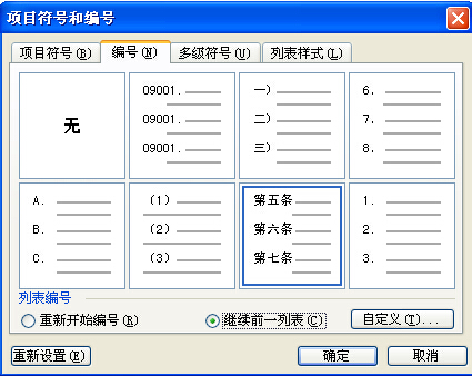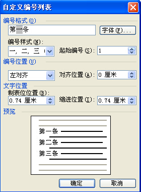 4、弹出自定义编号列表,在编号格式编号一的前、后输入“第”、“条”,如图所示;