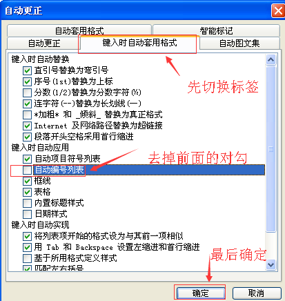 2、单击“键入时自动套用格式”选项卡,在“键入时自动应用”项目下取消勾选“自动编号列表”复选框,最后单击“确定”按钮完成即可。