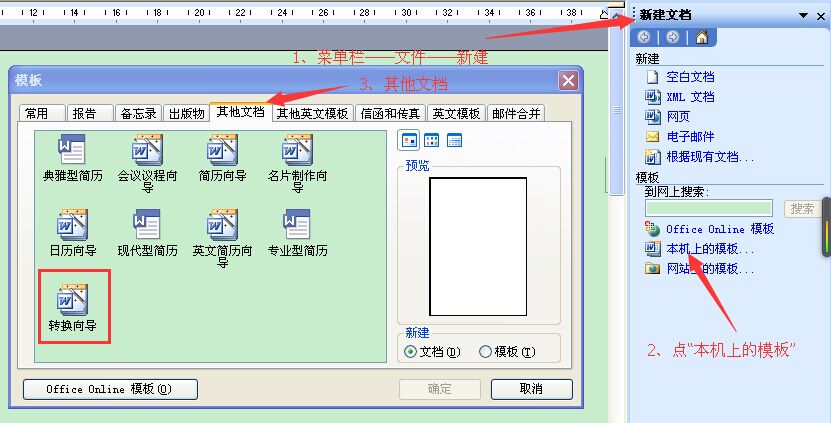 菜单栏——文件——新建:右侧出现“新建文档”窗格——本机上的模板——其他文档:转换向导。