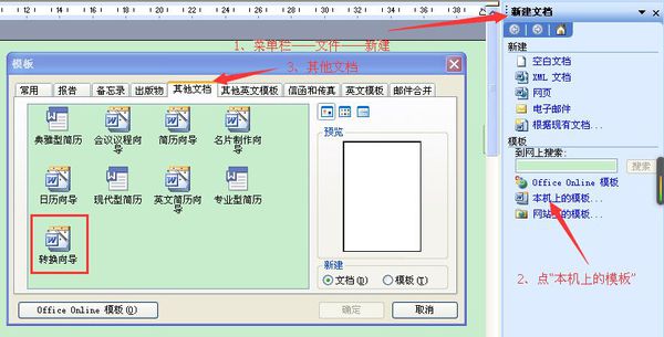 在“开始”菜单中选择“新建Office文档”,或选择“文件/新建”,这时会在屏幕右侧弹出“新建文档窗口”,此时需要单击编辑窗口右侧“新建文档”窗口中的“通用模板”。使用不同的Office版本所执行“转换向导”出现的界面可能稍有不同,但其中都有“转换向导”功能是一致的。