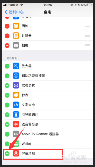 在自定义控制中,我们可以看到很多控制功能可以增加,比如:闹钟、相机、秒表、备忘录等等,我们往下滑动,选择“屏幕录制”,到这里我们预计把功能增加完成了。