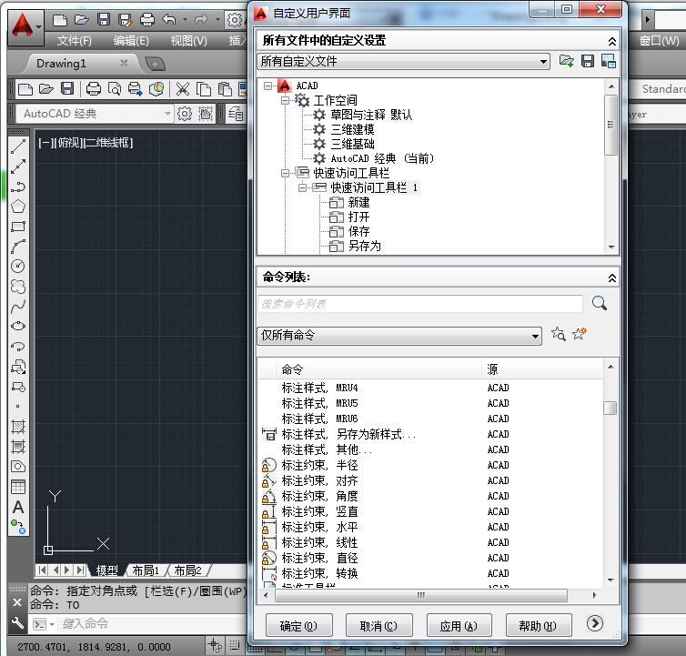 在对话框中我们看到了命令列表里面有CAD里面所有命令。