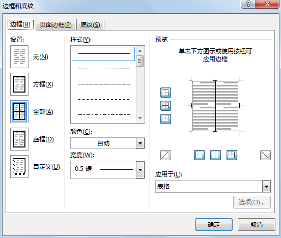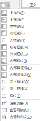 选择表格 开始 段落 单击边框右侧小三角形 边框和底纹