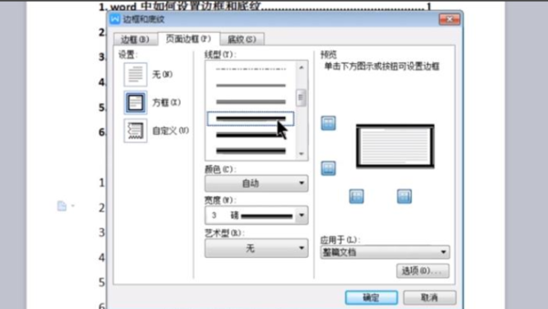 2、然后选择“方框”选项,选择所需的线型以及颜色和宽度,还可以打开“艺术型”,选择你想要的边框图案,点击“确定”。