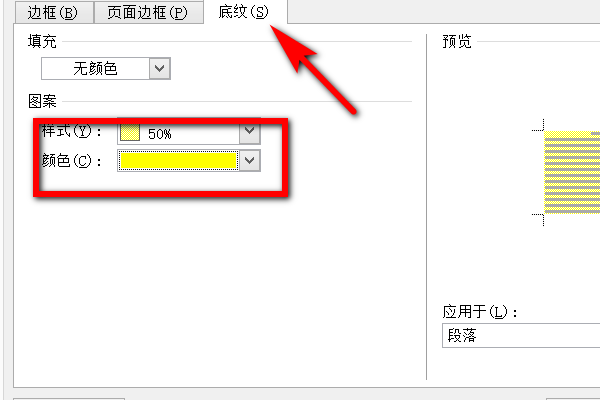 步骤三:可以看到有边框,页面边框,底纹这三个选项,这事当然要点击底纹,然后会出现选择填充颜色,和图案颜色的选项。
