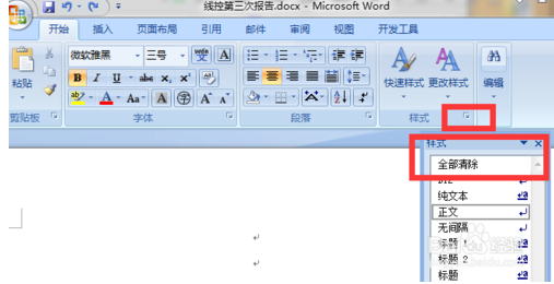 2.在Word菜单栏找到“样式”,单击下拉菜单,并选择最顶上的“全部清除”如下图: