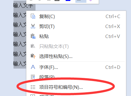 2、然后点击鼠标右键,在弹出的选项中选择“项目符号和编号”选项。