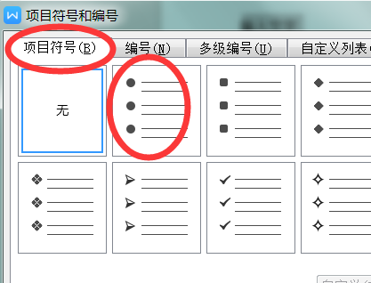 3、然后在打开的“项目符号和编号”对话框中选择“项目符号”并点击其中的黑色圆点的样式。