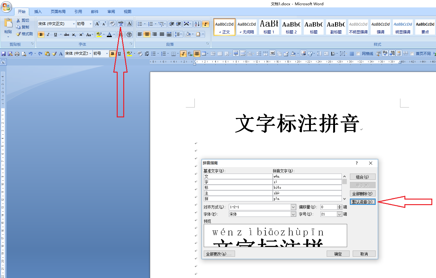 1.选中需要标注拼音的文字,单击“开始”菜单,单击“拼音指南”命令,在弹出的“拼音指南”对话框中单击“默认读音”按钮,如下图: