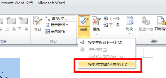 3、然后我们点击“接受”的下拉菜单选择“接受全部修订”即可。