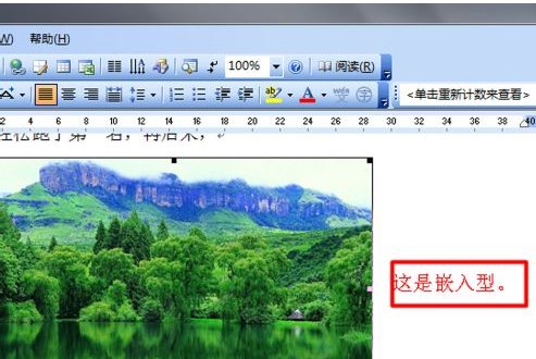 3、先选择【嵌入型】,选择后单击确定。之后出现的编辑板面可能会出现有些文字距离拉大,可以另起一段,回车即可;