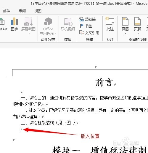 1.打开目标word文档,进入编辑模式,找到左上顶端的菜单模块,选择插入模块。