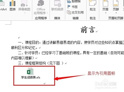 5.也可以在word文档中,插入excel数据的图标,不显示表格,需要查看表格时,点击图标即可。