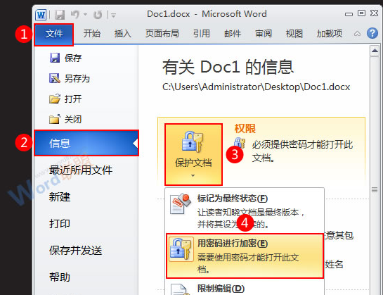 1、单击窗口左上角的“文件”按钮,打开“信息”面板,然后选择“保护文档”下的“用密码进行加密”。