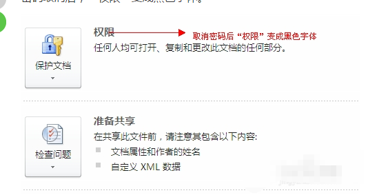 和加密过程相似,“文件”---“信息”---“权限”---“用密码进行加密”,然后删除密码提示框中的密码,保持空白,点击“确定”。密码取消。